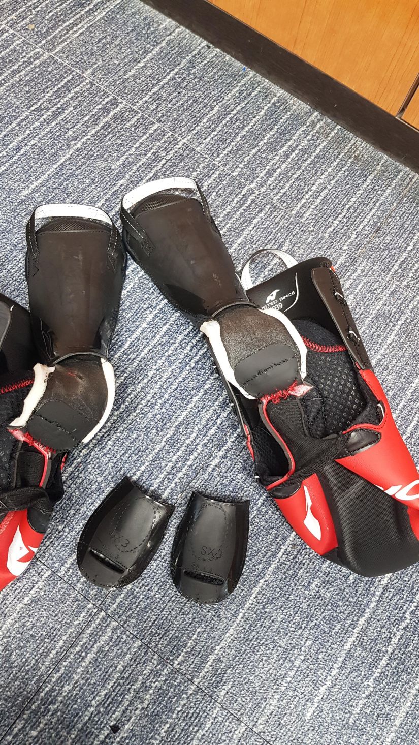 이너부츠를 뒤집어 고통이 오는 부분의 플라스틱을 제거합니다.